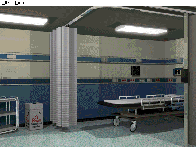 Virtual Surgeon takes advantage of CD-ROM space by including a lot of multimedia elements. You can now explore the hospital from the first-person perspective and talk to other hospital personnel played by digitized actors. A lot of the acting (by obviously amateur actors) is quite bad, but at least that is not the core o the game. The in-game library contains a lot of in-depth reference material on various heart diseases and surgical procedures, presented via video clips and text, although you should be prepared to climb a relatively steep learning curve the first time you play the game.