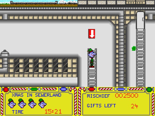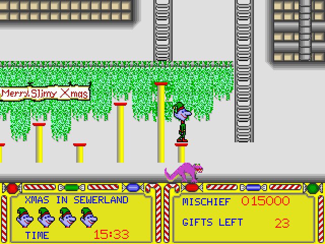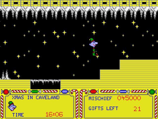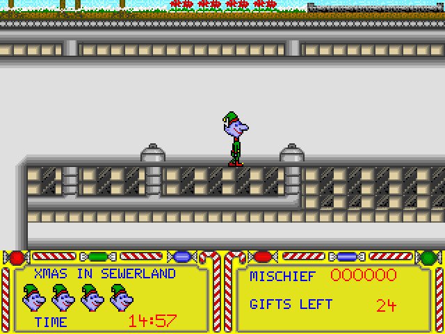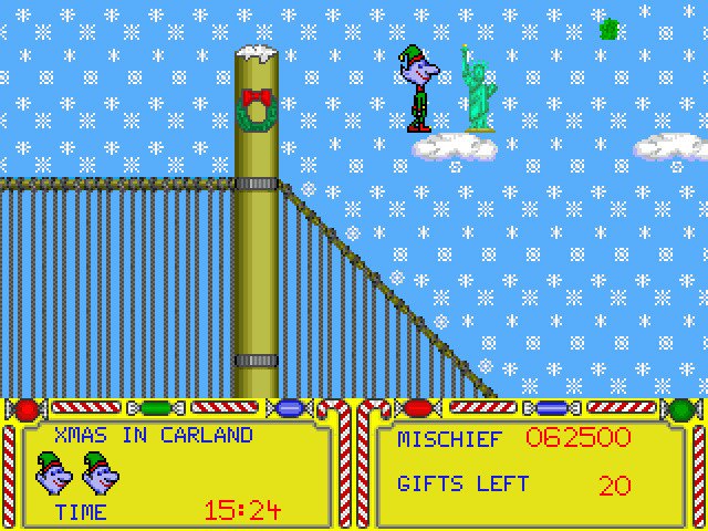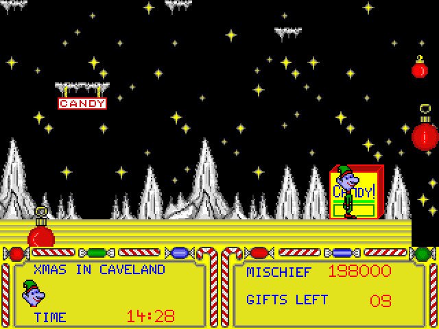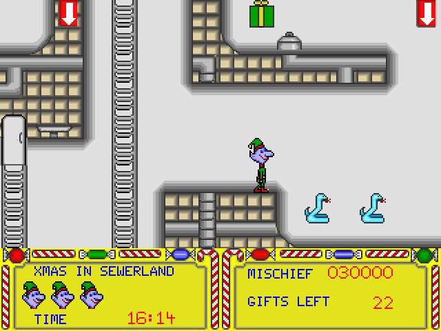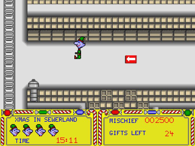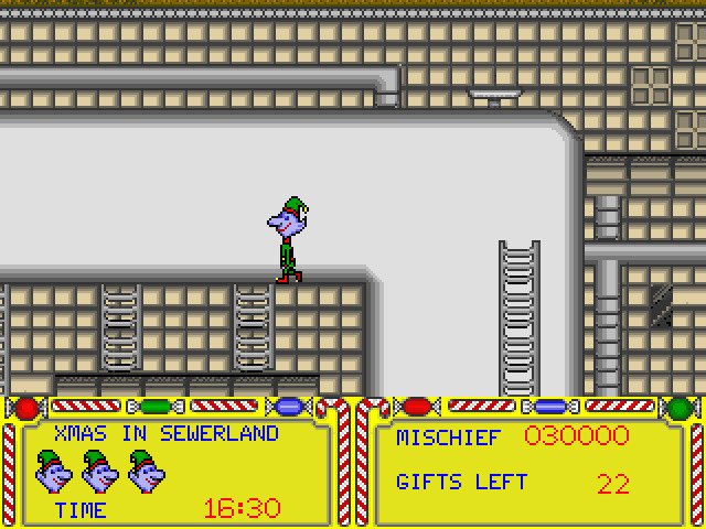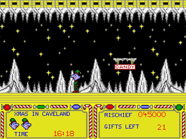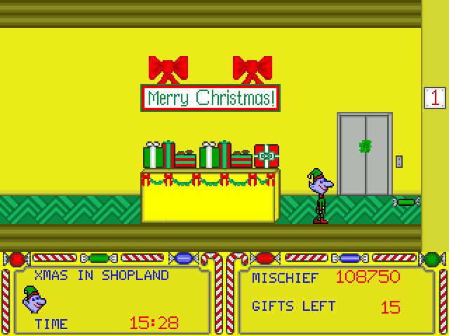 Here is the video game “Wally The Mischievous Elf”! Released in 1994 on DOS, it's still available and playable with some tinkering. It's an action game, set in an arcade, christmas and platform themes.