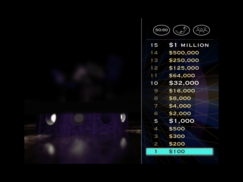 Here is the video game “Who Wants to Be a Millionaire: 3rd Edition”! Released in 2001 on Windows, it's still available and playable with some tinkering. It's a puzzle game, set in a game show / trivia / quiz and licensed title themes and it was released on Mac as well.