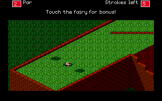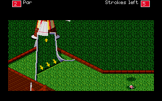 The holes start out easy and gradually get more difficult and imaginative, so beginners will have many chances to perfect their strokes before the more difficult holes. The graphics are crisp and clear in EGA, and ball physics and handling are both excellent.