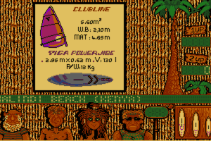 A challenging 3D windsurf simulator that features 15 scenarios that range from speed to trick-surfing high waves. It's not authentic, and the waves are difficult to see with awful graphics-- the game is fun for a while until you discover California Games 2 or the Amiga version, which has much better music in addition to crisp graphics.