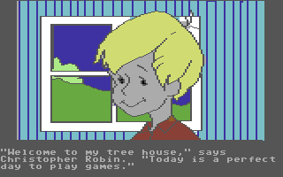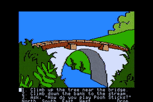 Even the premise is original: the blustery wind has blown objects out of houses in the Hundred Acres Wood, scattering them all over the forest. As none other than helpful bear Winnie the Pooh, you must locate the objects and return them to their rightful owners. Gameplay in Winnie the Pooh is simple to understand, yet effective: every screen presents one or more choices for actions that are specific to that screen (e.g. "Climb up the tree"). There is also a row of verbs along the bottom of the screen for general actions, such as Drop the item you are carrying, and go North, South, etc. All the characters kids have come to love are here, from Eeyore the inconfident, to Rabbit the active and Owl the wise who will give helpful clues if you ask him about the object you are carrying. Experience with Pooh books is helpful, since you will likely know right away which objects belong to which person when you see them, but it is not necessary because the characters give plenty of clues about what they lost.