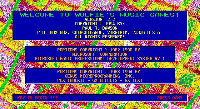 Wolfie's Music Games is a video game published in 1992 on DOS by Paul T. Dawson. It's an educational game.