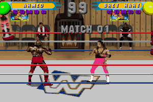 There's also various double damage bonuses for high-risk moves, and even fatality style finishing moves, although there's no blood or flying limbs; presumably the WWF is too 'nicey nicey' for that. And of course, there's the obligatory combos. This game doesn't do things by halves.
