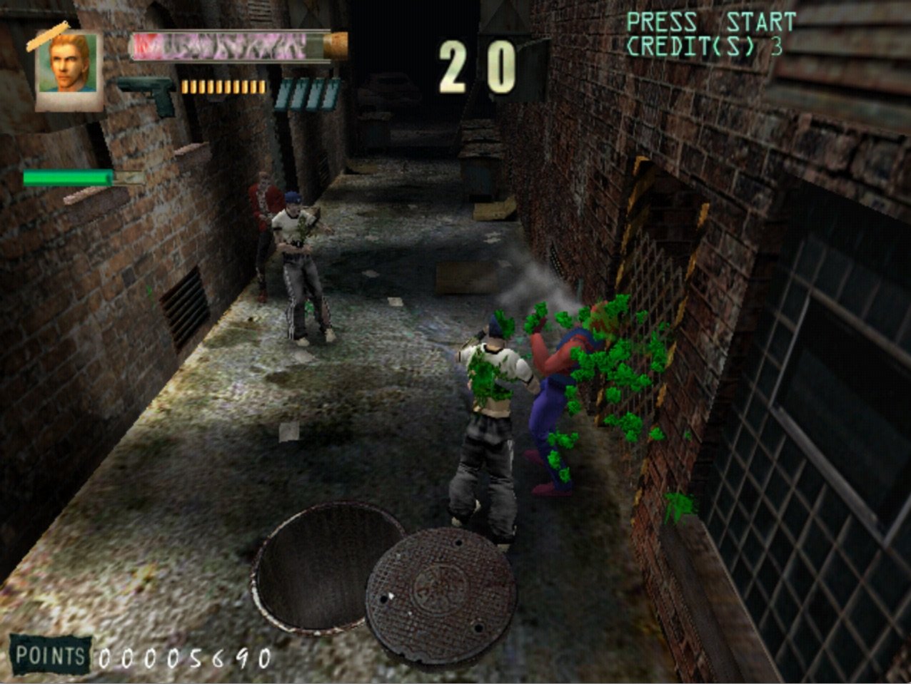 Here is the video game “Zombie Revenge”! Released in 1999 on Arcade, it's still available and playable with some tinkering. It's an action game, set in an arcade, horror and beat 'em up / brawler themes.