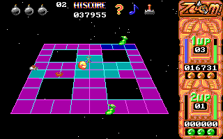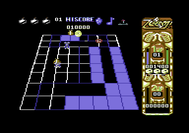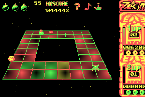 Played from an isometric perspective, your goal is to guide a Pac-Man-lookalike as he gobbles up not dots, but lines on the playing field. Gobble up four sides of a square to turn it into a different color. You will gain access to the next level after every tile on the field changes color. The task is not as easy as it sounds, because you must avoid monsters that will deplete your hit points, including crabs, floating mouths, and others. Power-up items appear at random to help you along, although there never seems to be enough of them on each level.